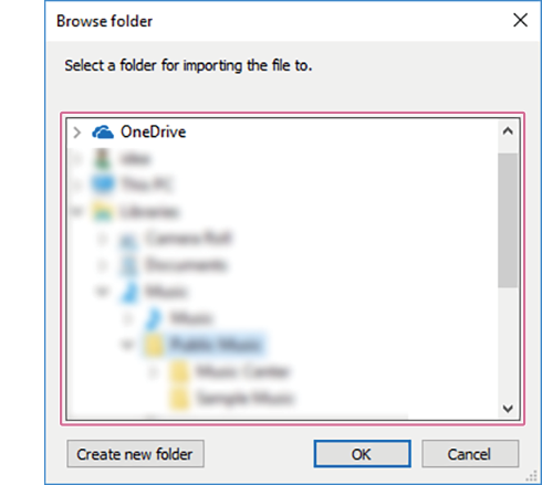 De opgegeven map wordt toegevoegd aan de bibliotheekmap. Vervolgens wordt de inhoud van de map geimporteerd in "Music Center for PC".