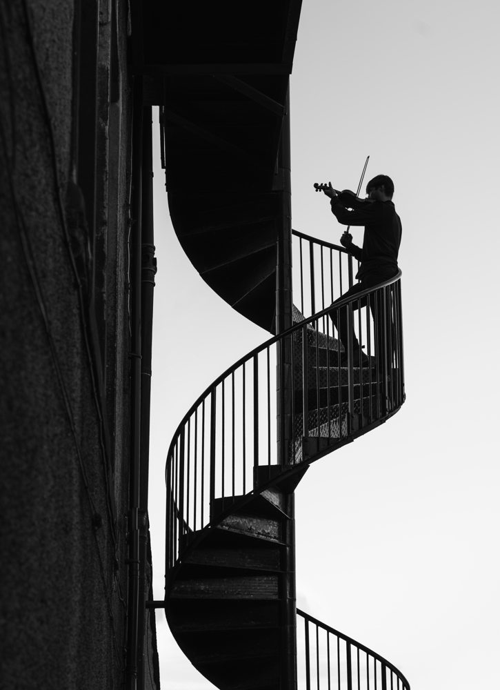 Black and white photo of a man standing on a dark spiral staircase playing the violin. © Gary Williamson | Sony α7C II + FE 20-70mm F4 G lens