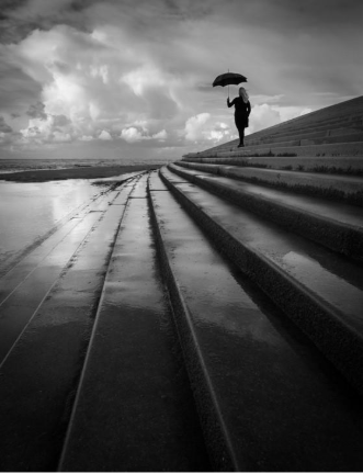 Black and white photo of a blonde-haired woman in a trench coat, who is carrying an open umbrella and standing on steps with dark contrast, that run from the beach. © Gary Williamson | Sony α7C II + FE 16-25mm F2.8 G lens