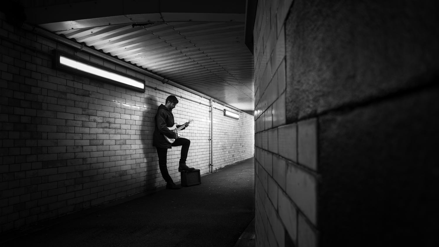 Black and white photo of a paved side street, captured with a wide perspective that emphasises the road lines and shows fire escape stairs on the side of a building. In the distance, a man in a baseball cap and jacket is seen rounding the corner, with his back to the camera. © Gary Williamson | Sony α7C II + FE 16-25mm F2.8 G lens