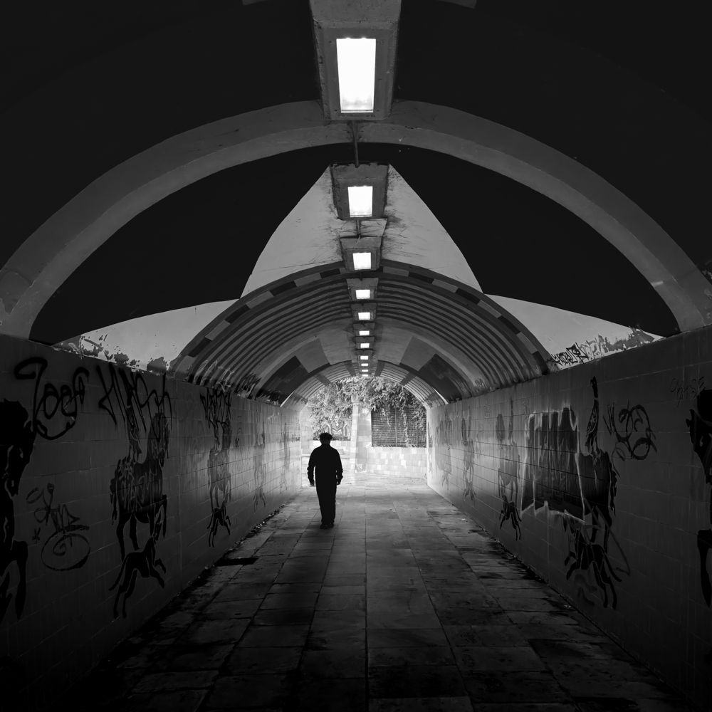 Black and white photo showing a silhouette walking through an underground tunnel, nearing the sunlight outside. The person wears a beret and has their back to the camera, while the tunnel walls feature graffiti and the dome-shaped roof is lined with a row of lights and painted with geometric designs. © Gary Williamson | Sony α7C II + FE 24-50mm F2.8 lens