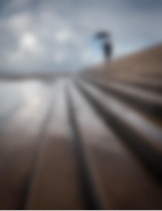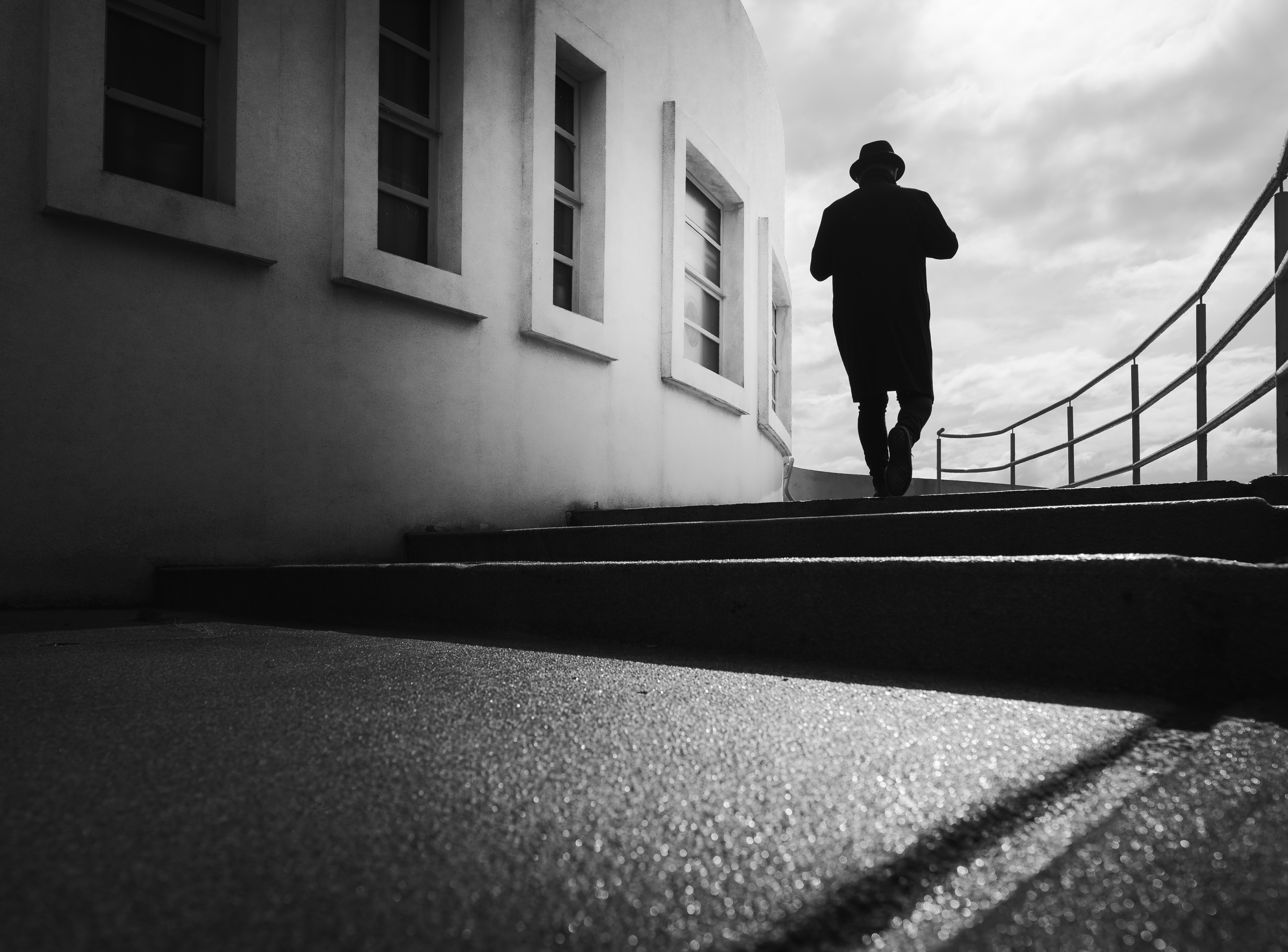 Black and white photo captured at a low angle, showing a silhouette of a person in a coat and fedora climbing stairs with their back to the camera. There is dark contrast on the stairs, which are next to a bright, white building, and the sky is cloudy. © Gary Williamson | Sony α7C II + FE 16-25mm F2.8 G lensÀ propos de Gary Williamson