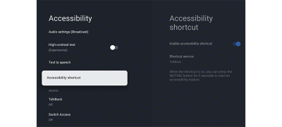 Le raccourci d'accessibilité vous permet d'activer et de désactiver les fonctionnalités d'accessibilité en un instant. Il suffit d'appuyer de manière prolongée sur le bouton de coupure du son de votre télécommande. Vous pouvez associer ce raccourci à la fonctionnalité d'accessibilité dont vous vous servez le plus souvent.